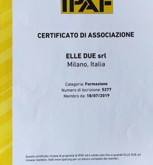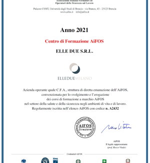 Elledue S.r.l. has obtained the certification of its integrated quality, environment and safety system according to UNI EN ISO 9001: 2015, UNI EN 14001: 2015, ISO 45001: 2018 for the IAF 35 and 37 sectors. Since 2016 it is a training center accredited by AIFOS - Italian Association of Safety Trainers at number A2432) Since 2019 it has become an IPAF international training center (international center no.5277)